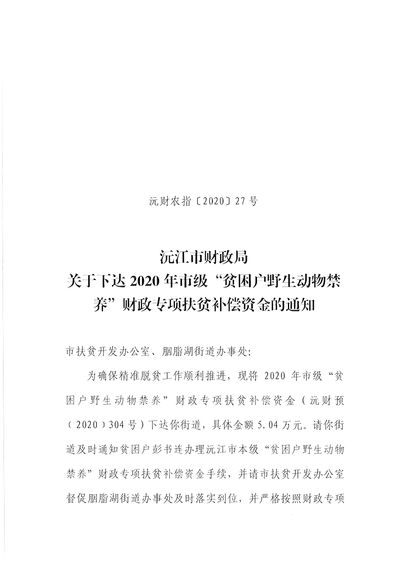 沅江市財政局關于下達2020年市級“貧困戶野生動物禁養”財政專項扶貧補償資金的通知 沅財農指[2020]27號