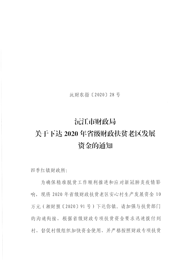 沅江市財(cái)政局關(guān)于下達(dá)2020年省級(jí)財(cái)政扶貧老區(qū)發(fā)展資金的通知 沅財(cái)農(nóng)指[2020]28號(hào)