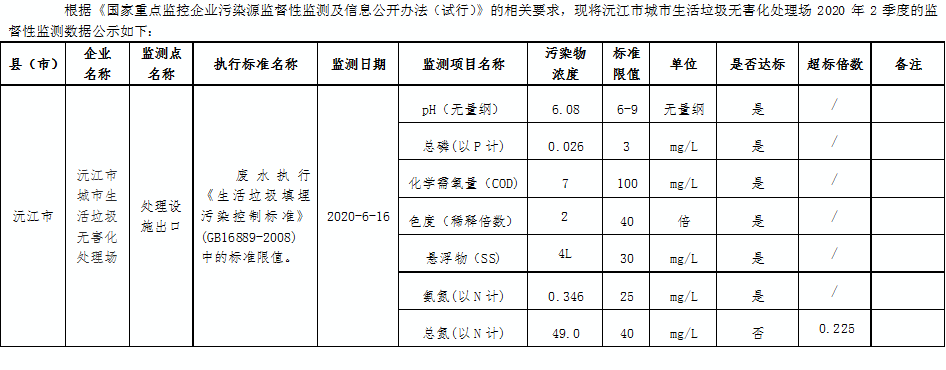 沅江市城市生活垃圾無害化處理場2020年2季度污染源監督性監測數據公開