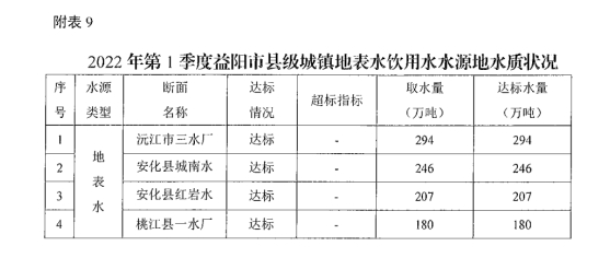 根據《益陽市生態環境保護委員會辦公室關于2022年4月份全市環境質量狀況的通報》(益生環委辦[2022]34號)文件,沅江市1個在用縣級集中式地表水飲用水水源水質均達標,達標率為100%。詳見文件中附表9。