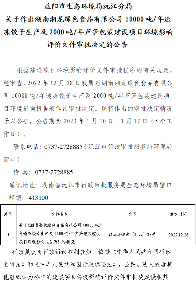 關(guān)于作出湖南湘龍綠色食品有限公司10000噸/年速凍餃子生產(chǎn)及2000噸/年蘆筍包裝建設(shè)項(xiàng)目環(huán)境影響評(píng)價(jià)文件審批決定的公告