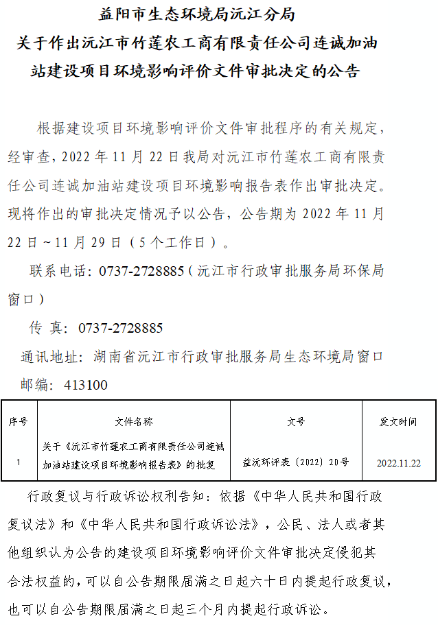 關于作出沅江市竹蓮農工商有限責任公司連誠加油站建設項目環境影響評價文件審批決定的公告