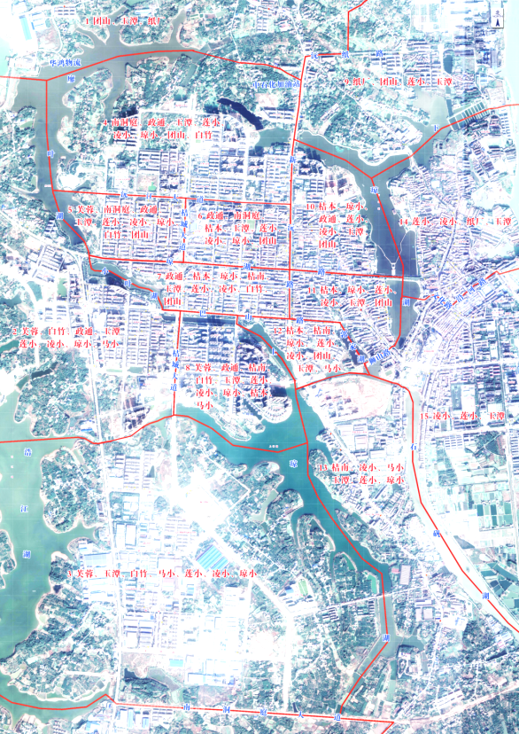 城區(qū)以大道河流湖泊為分界線劃分為15個(gè)區(qū)域(塊),每個(gè)區(qū)域的學(xué)生按照規(guī)定的招生學(xué)校填報(bào)志愿后,分批次按志愿進(jìn)行派位。