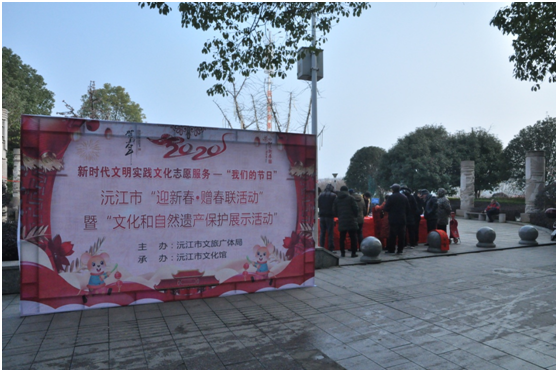 鼠來豕去遠,春到景更新。2020年1月17日上午,沅江市洞庭公園大門前熱鬧非凡,由沅江市文旅廣體局主辦,市文化館承辦的“新時代文明實踐文化志愿服務---我們的節日”之沅江市“迎新春 贈春聯活動”暨“文化和自然遺產保護展示活動”在這里拉開序幕。