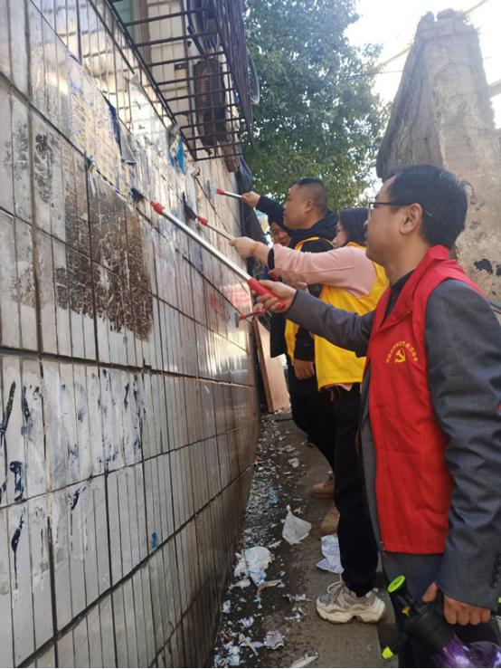 這些小廣告真難清理,大多數都是用不干膠粘貼的,要先用清水濕化,再用鏟刀使勁清除。經過幾個小時的努力,各個小區街道、樓道的墻面又回到了干凈面貌,志愿者的辛勤勞動換來社區的清潔,也算為群眾辦了一次實事。
