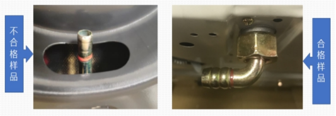 燃?xì)庠罹摺分兴镜膬煞N結(jié)構(gòu)(Φ9.5mm和Φ13mm),俗稱“寶塔頭”結(jié)構(gòu)(見圖3)。燃?xì)鈱?dǎo)管結(jié)構(gòu)不合格,可能導(dǎo)致燃?xì)夤苊撀洹⒙獾蕊L(fēng)險。