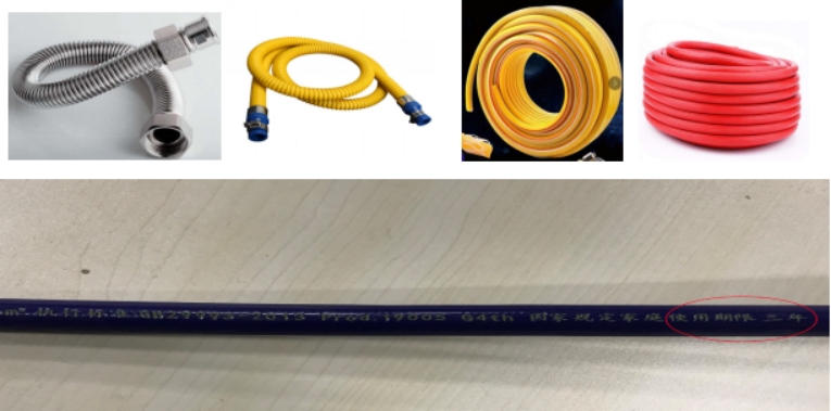 燃?xì)饩哌B接用軟管,是用于家用燃?xì)饩叱隹谂c用戶燃?xì)馊紵骶哌B接用的軟管。根據(jù)材料不同分為:金屬(波紋)軟管和非金屬(橡膠或橡塑復(fù)合)軟管。依據(jù)GB55009-2021《燃?xì)夤こ添椖恳?guī)范》,從2022年1月開始,居民家中不得使用常用的老式燃?xì)饽z管,老式燃?xì)饽z管容易被老鼠咬破,且使用年限無法滿足相關(guān)要求。橡膠或橡塑軟管上連續(xù)長度每隔300mm或單根軟管應(yīng)標(biāo)注:產(chǎn)品名稱、規(guī)格、制造商名稱或縮寫、產(chǎn)品標(biāo)準(zhǔn)號、制造季度和年份、使用期限等內(nèi)容。(見圖5)