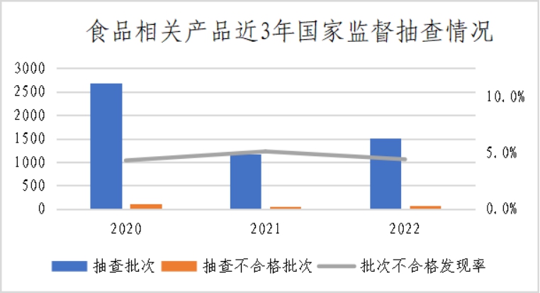 (一)抽查概況。本次抽查了1478家企業生產的1508批次產品,涉及嬰幼兒用塑料奶瓶、紙杯、一次性竹木筷、塑料瓶蓋、餐具洗滌劑、密胺塑料餐具、塑料一次性餐飲具、復合膜袋、食品包裝用紙和紙板材料、食品接觸用紙容器、工業和商用電熱食品加工設備、工業和商用電動食品加工設備、月餅過度包裝等13種產品。其中,3批次產品涉嫌超范圍生產、無證生產等,已移送企業所在地市場監管部門處理。對1475家企業生產的1505批次產品進行了檢驗,檢出66批次產品不合格,不合格發現率為4.4%。食品相關產品近三年整體不合格發現率分別為4.3%、5.1%、4.4%。