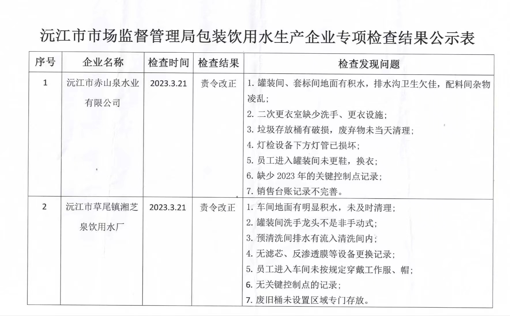 附件:沅江市市場監督管理局包裝飲用水生產企業專項檢查結果公示表