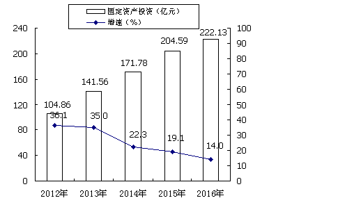 投資穩(wěn)步增長。2016年,全市完成固定資產(chǎn)投資222.13億元,同比增長14.0%。全市重點建設項目103個,總投資211.3億元,年度計劃投資81.67億元,累計完成投資55.26億元。