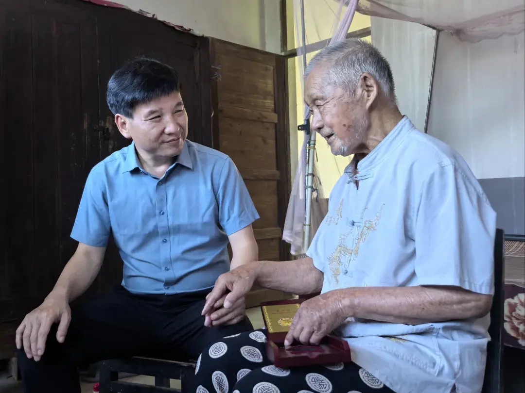 在中國(guó)人民抗日戰(zhàn)爭(zhēng)暨世界反法西斯戰(zhàn)爭(zhēng)勝利80周年之際,8月19日,沅江市委副書(shū)記、市長(zhǎng)羅必勝赴胭脂湖街道楊梅山村,走訪慰問(wèn)抗戰(zhàn)老兵胡良術(shù),向他致以親切問(wèn)候和崇高敬意,并送上由中共中央、國(guó)務(wù)院、中央軍委頒發(fā)的“中國(guó)人民抗日戰(zhàn)爭(zhēng)勝利80周年”紀(jì)念章。