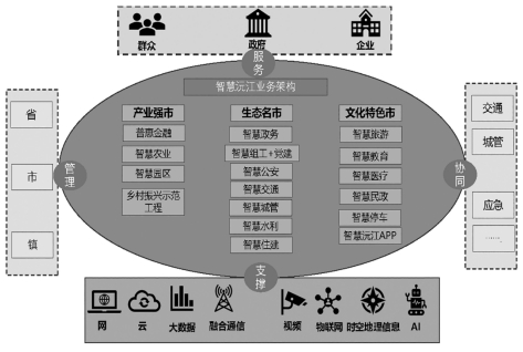 2、業務架構。智慧沅江業務架構圍繞管理者、居民、企業三大主體,開展城市管理、民生服務、產業經濟服務三大領域的建設。管理者、居民、企業的需求主要聚焦于城市管理全面精準、民生服務普惠均、產業經濟服務提質升級等。通過智慧沅江的建設,管理者將逐步利用大數據、人工智能等手段為科學決策、業務監督、應急指揮與業務協同提供支撐;居民在醫療、教育等方面惠民服務需求將得到滿足;管理者致力于優化存量產業和做大增量產業,企業將得到高效便捷園區服務,并形成上下游良好配套,實現沅江的跨越式發展。縣級智慧城市的建設,一方面滿足沅江規劃、發展、建設、運行、服務和管理等方面統籌管理需求;另一方面根據市級業務需要,具體落實和支撐所屬層級與益陽市級業務的對接。業務架構如下圖所示。