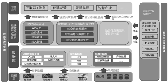 3、數據架構。數據架構主要包含數據采集、數據資源匯聚融合、數據服務、數據應用、數據治理和管理、數據生命周期管理等內容;重點解決各應用對管理機制和共性技術的訴求,并提供對外服務接口。智慧沅江數據架構如下圖所示。