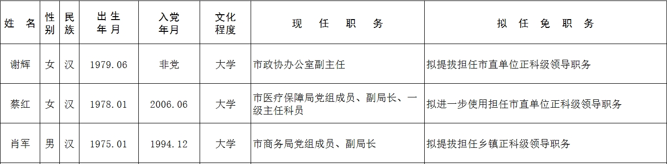 為了加強對干部選拔工作的監督,提高識別和任用干部的準確程度,現對市委常委會會議研究決定的擬任職人選進行任前公示。