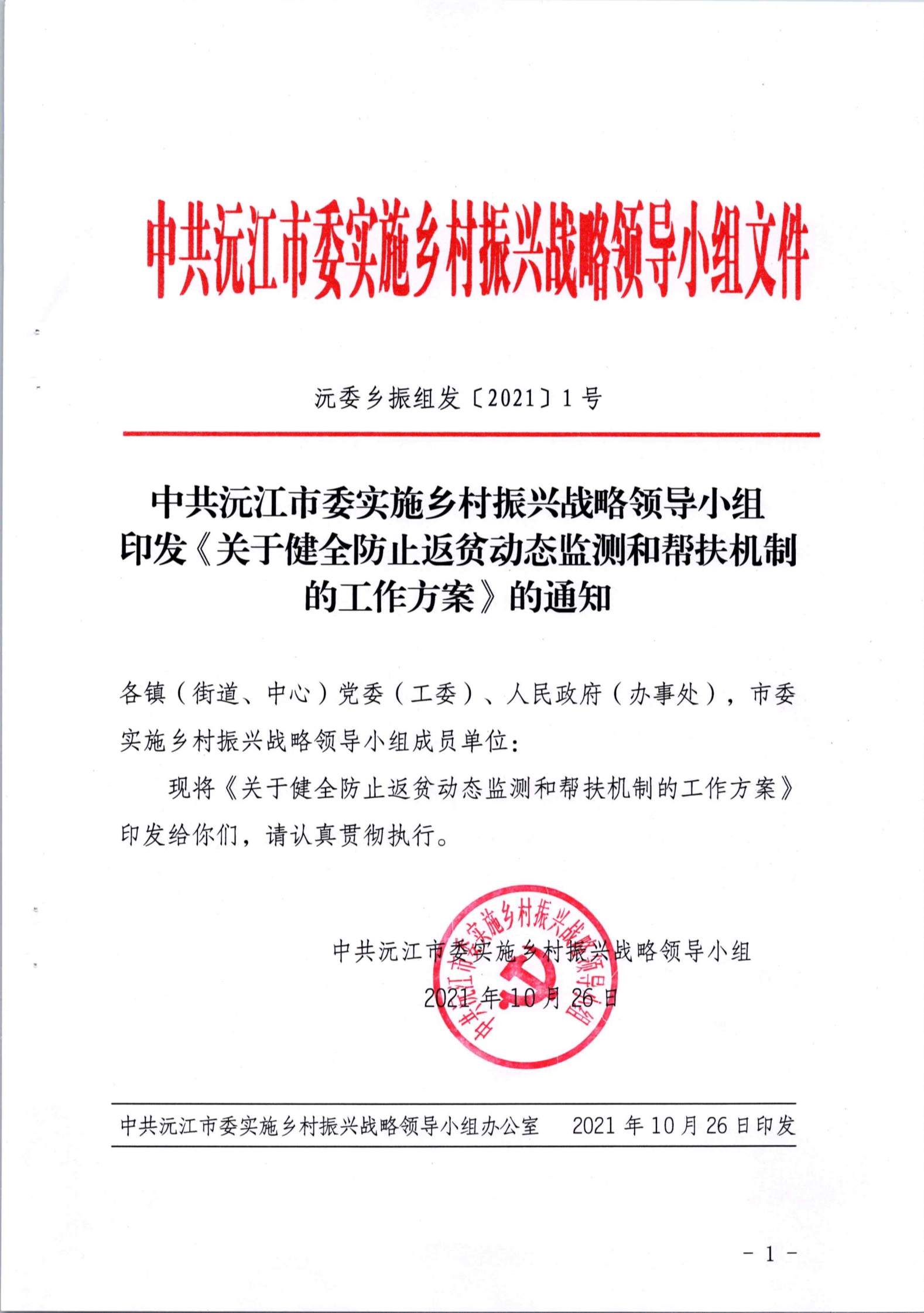 沅委鄉振組發〔2021〕1號印發《關于健全防止返貧動態監測和幫扶機制的工作方案》的通知