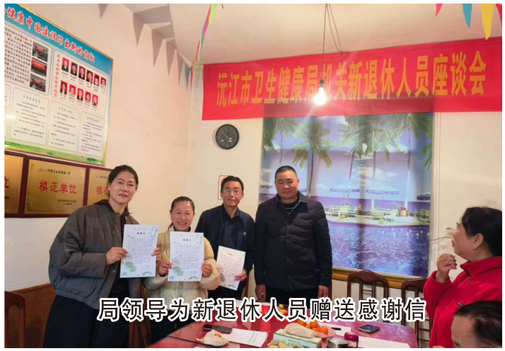 2025年12月4日,市衛生健康局為今年新退休的干部職工召開座談會,感謝曾洞庭、肖清輝、湛 芳三位今年退休的同志,幾十年來為我市衛生健康事業發展作出的貢獻。