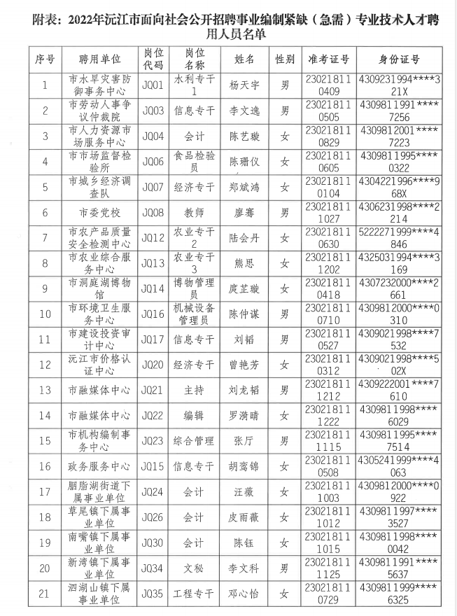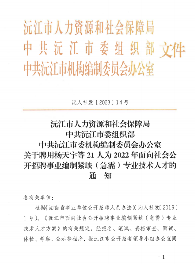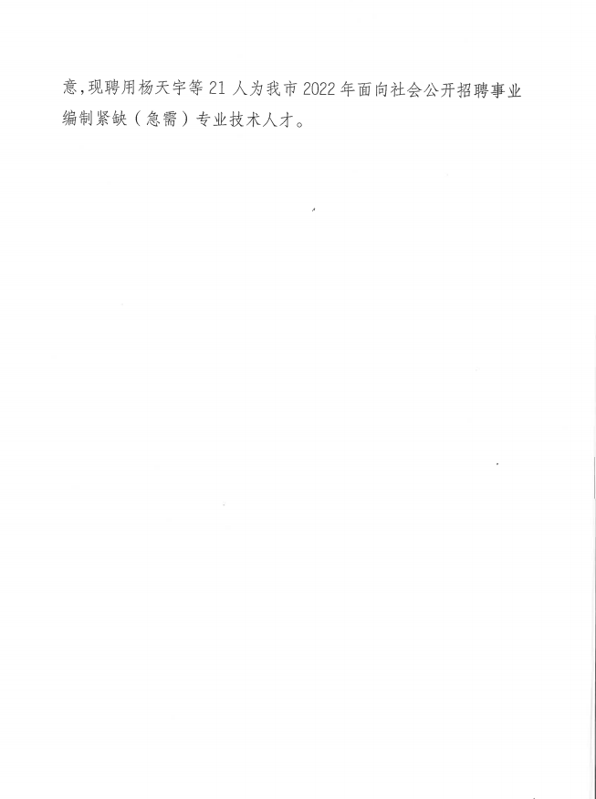 關于聘用楊天宇等21人為2022年面向社會公開招聘事業編制緊缺(急需)專業技術人才的通知