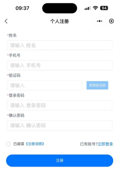 三、注冊填寫申請人的姓名、手機號,而后點擊“獲取驗證碼”,手機將收到驗證碼短信,輸入短信驗證碼并填寫,申請人輸入登錄密碼(密碼必須設置英文和數字組合,滿8位英文和數字),“確認密碼”與“登錄密碼”必須一致。勾選“已閱讀”后點擊“注冊”。