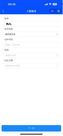 四、填入“身份證號碼”,性別和出生年月自動彈出,直接點擊“下一步”進行人臉識別。