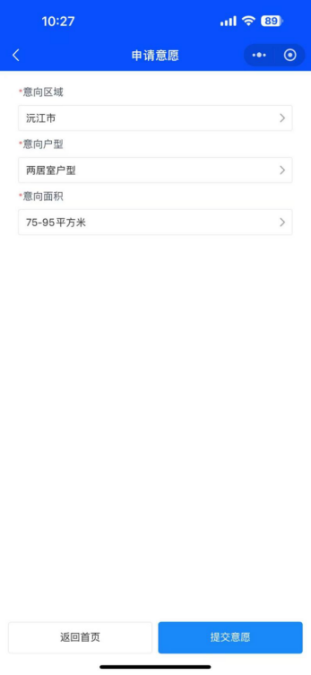十三、針對申請人意愿選擇“意向區域、意向戶型、意向面積”,選擇完成后點擊“提交意愿”,完成所有操作。