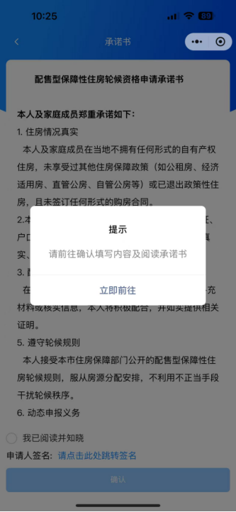 十二、點擊“立即前往”,接著返回到“承諾書”界面。勾選“我已閱讀并知曉”,并繼續點擊“請點擊此處跳轉簽名”,進行申請人個人“簽名”,簽名完成后點擊確認。
