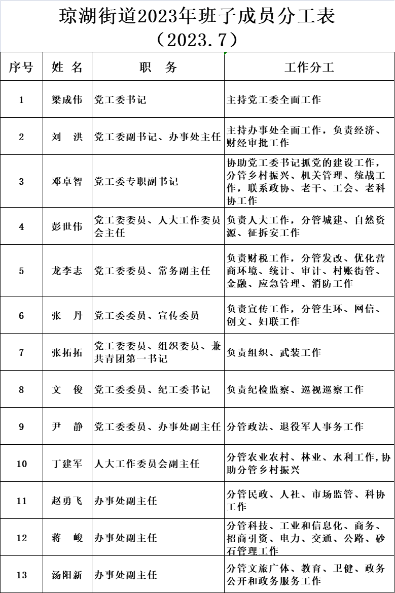 瓊湖街道辦事處班子成員分工表(2023.7)