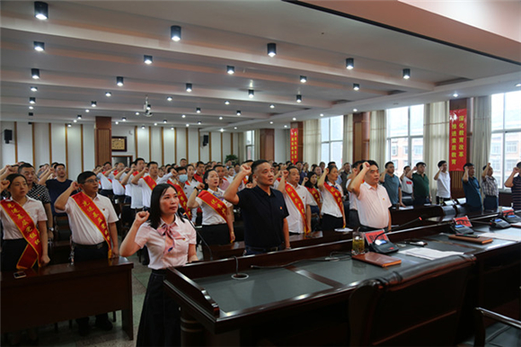 大會開始前,全市各高中類、中心學校類學校黨組織書記、黨務工作負責人、教育局黨委班子、局機關各股室站長、局機關黨支部書記和先進典型代表近135人面對黨旗,高舉右手,重溫入黨誓詞。