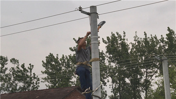 7月12日傍晚,在紅旗電排附近,吳映輝和他的同事正在搶架臨時照明線路。吳映輝告訴記者,自7月2日,他們對全垸照明燈具進行檢查,更換幾百盞照明燈,確保防汛工作的照明需要。