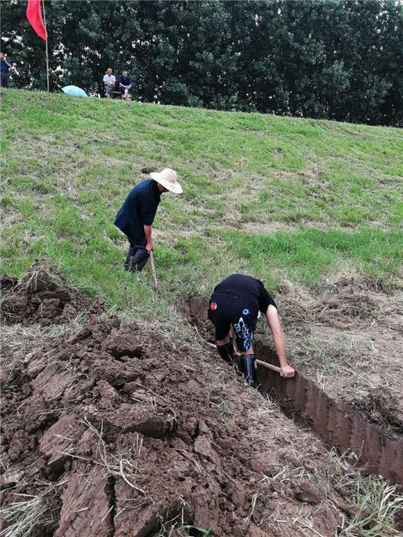 上大堤后爺爺教孫子的第一個工作是怎么開挖浸溝,爺爺舉起鋤頭示意王迅照著動作學,邊挖邊講標準的浸溝是什么樣的,挖浸溝是做什么用的。50后爺爺帶領95后孫子戰斗在防汛一線的事跡得到了中隊所有干部的肯定,爺孫倆甘于奉獻,齊心抗洪,紅色精神代代相傳。