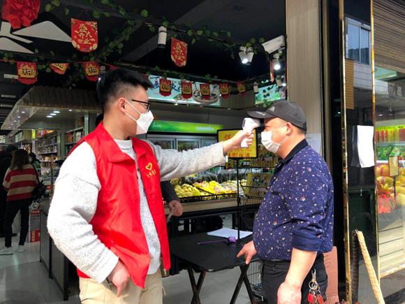 “等下,請量下體溫再入店購物。”2月26日,在陽羅洲鎮(zhèn)李胖子水果超市店門口,正好碰到有人準備進店購物,永興社區(qū)湖心路“街長”易勝波趕緊上前量體溫,此時巡街隊員黃家奇見狀也趕緊上前幫忙,為超市購物人員遞上溫馨提示,提醒他們口罩要佩戴正確、出門切記戴口罩。