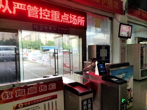 在市百合汽車(chē)站入口處,一臺(tái)健康碼識(shí)別機(jī)和紅外線測(cè)溫設(shè)備,正自動(dòng)查驗(yàn)旅客三碼、測(cè)量旅客體溫,確保有進(jìn)必檢,不漏一人。