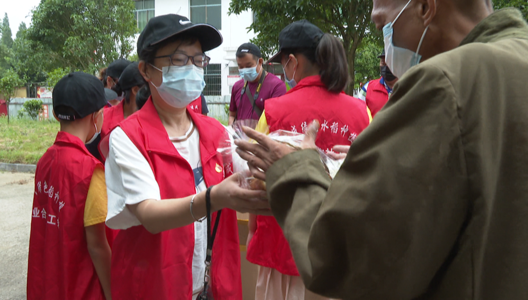 上午10點,草尾鎮上碼頭敬老院熱鬧非凡,一群身著紅馬甲的愛心人士將一袋袋面包分發到老人們手中,與他們親切交流,向他們致以親切的問候。與此同時,他們還將一箱箱打好包的御寒衣服、水果、食品等物資搬運到敬老院內。