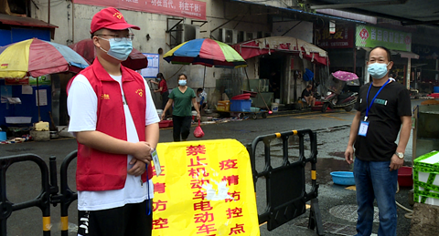 劉涵正在為進入市場的老人測量體溫