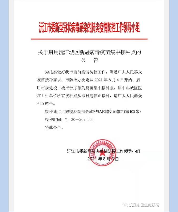緊急發布:關于啟用沅江城區新冠病毒疫苗 集中接種點的公告