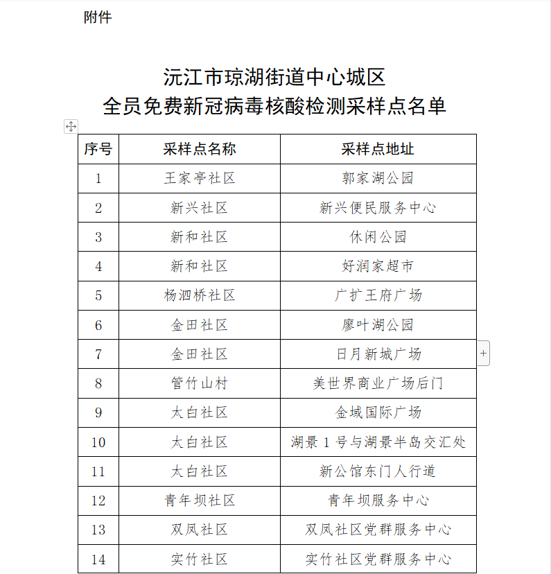 具體采樣點詳見附件《沅江市瓊湖街道中心城區全員免費新冠病毒核酸檢測采樣點設置表》,請轄區內居民按社區通知到指定地點采樣。