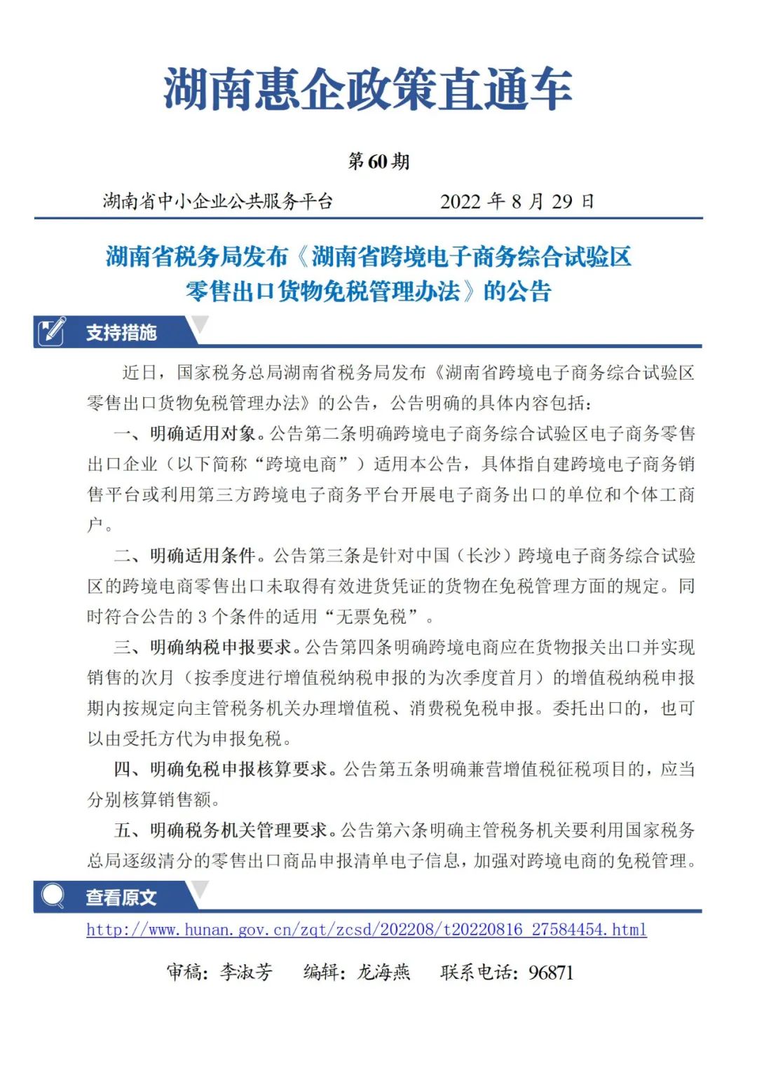 湖南省稅務局發布《湖南省跨境電子商務綜合試驗區零售出口貨物免稅管理辦法》的公告