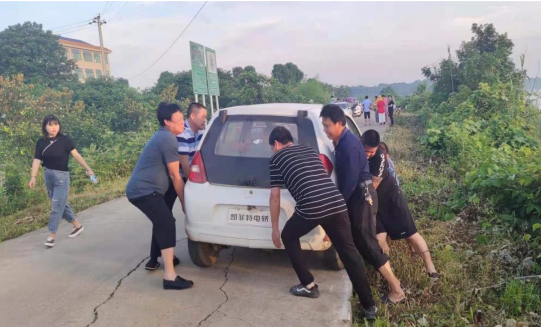▲車輛掉溝邊后,志愿者幫助車主擺正車身,疏通堵塞交通