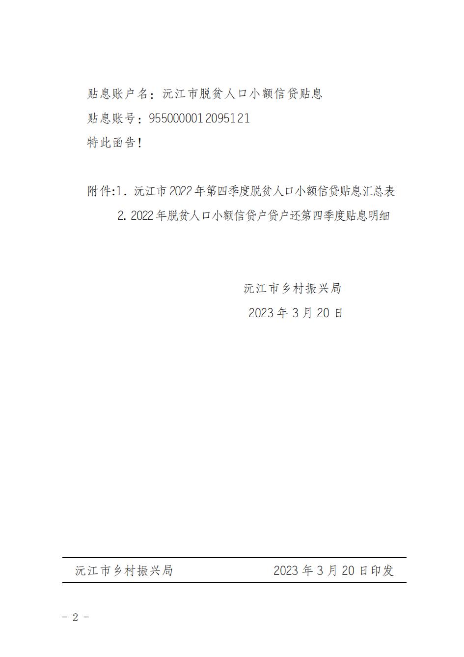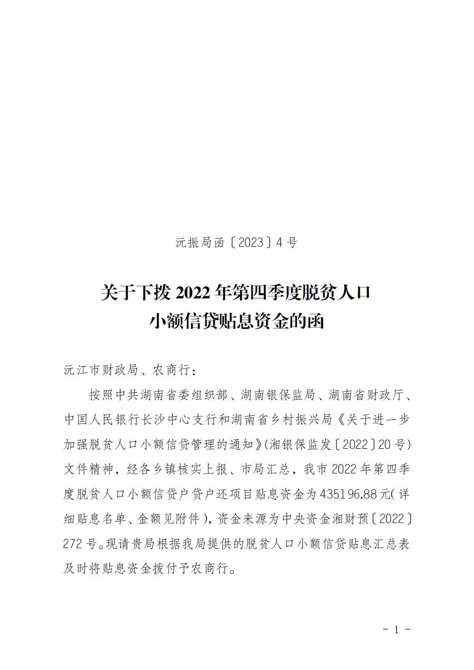 沅振局函〔2023〕4號(hào) 關(guān)于下?lián)?022年第四季度脫貧人口小額信貸貼息資金的函