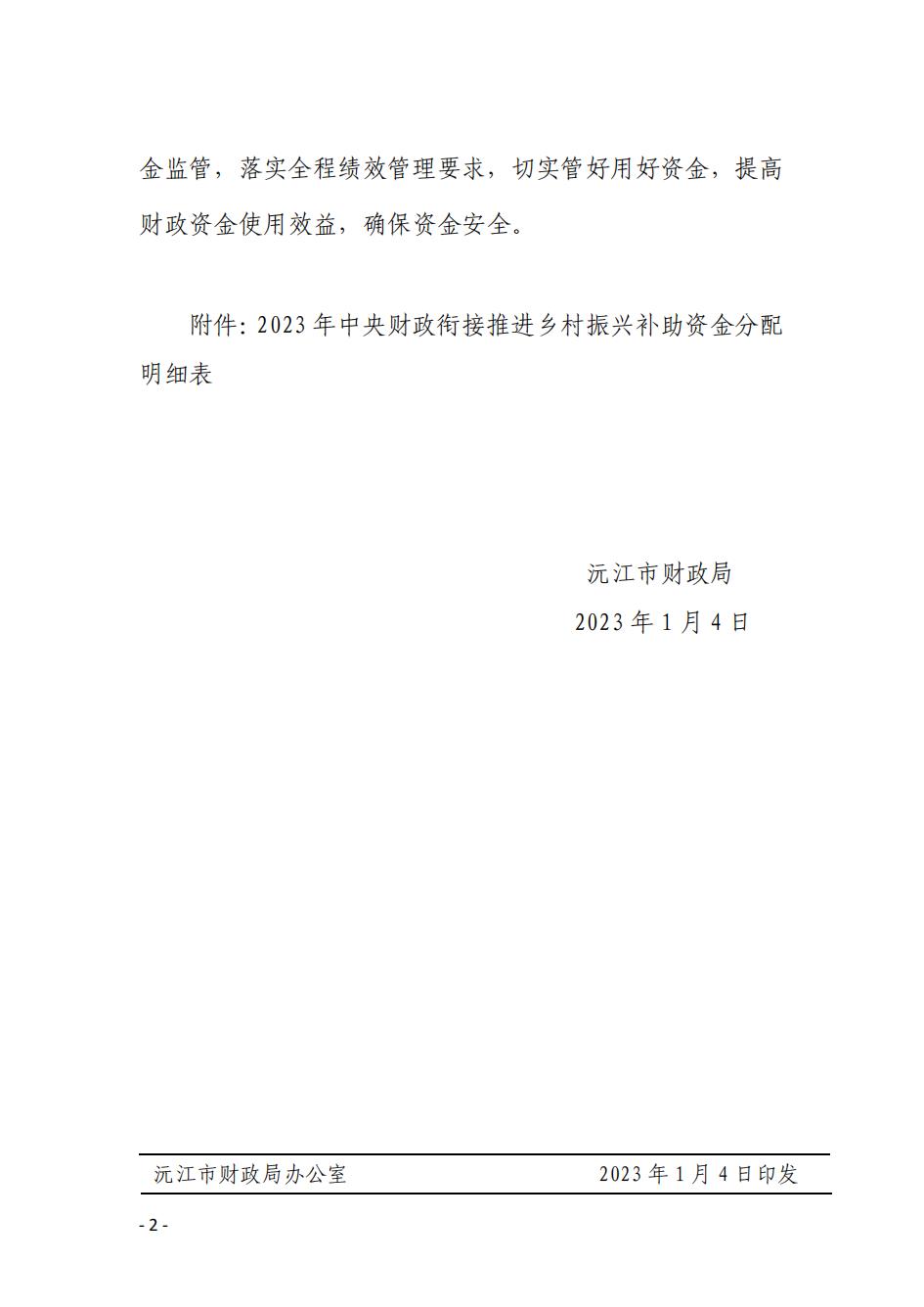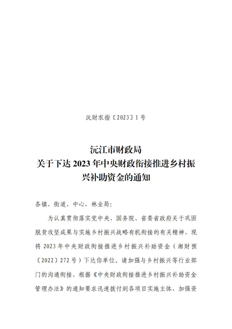 沅財農指〔2023〕1號 關于下達2023年中央財政銜接推進鄉村振興補助資金的通知