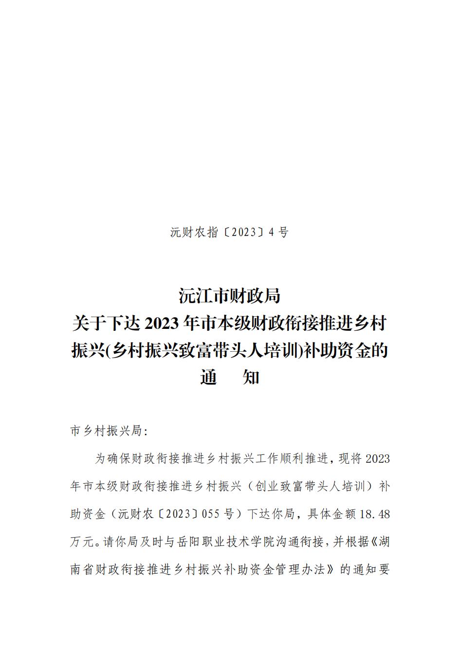 沅財農指〔2023〕4號 關于下達2023年市本級財政銜接推進鄉村振興(鄉村振興致富帶頭人培訓)補助資金的通知