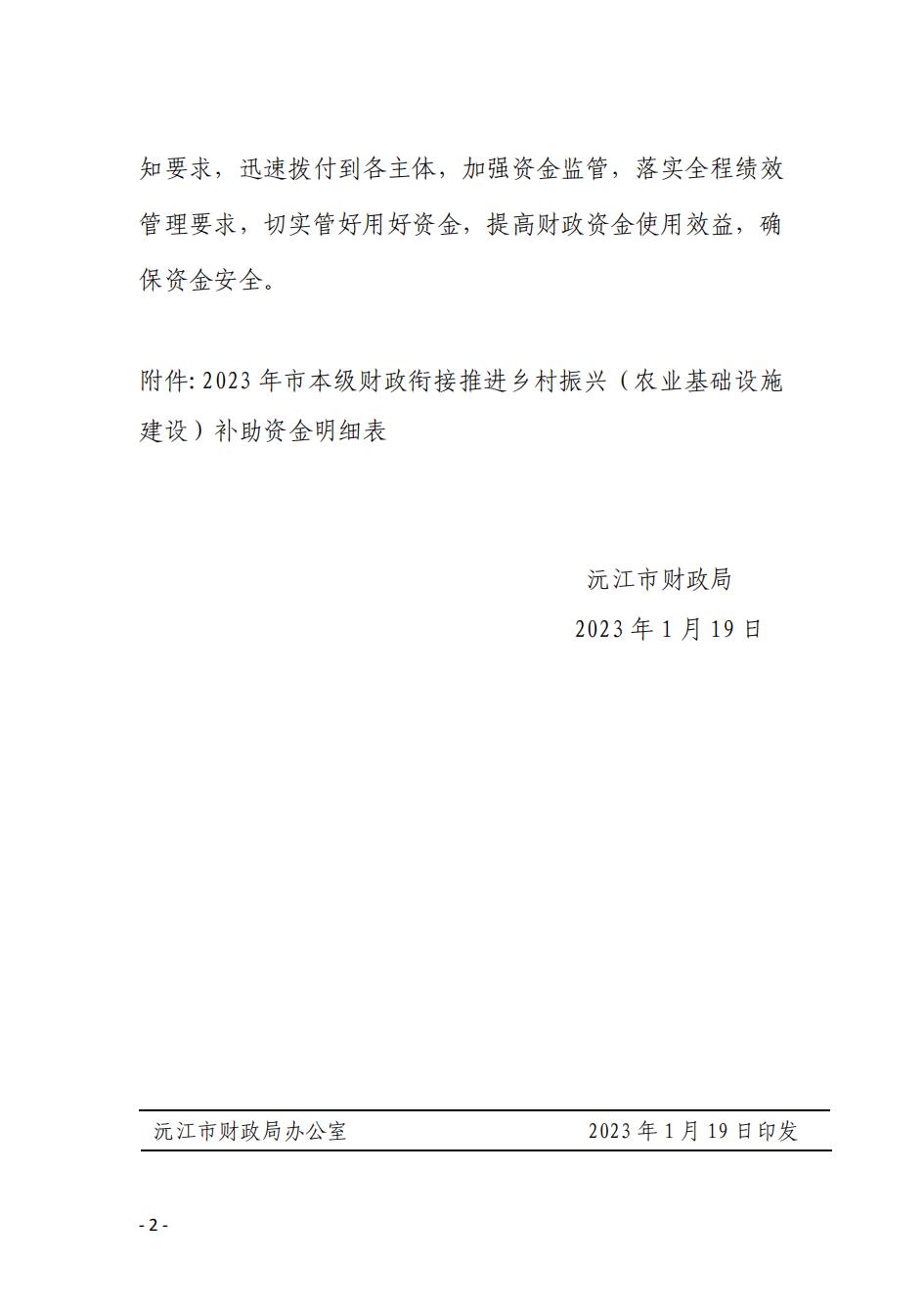 沅財農指〔2023〕5號 關于下達2023年市本級財政銜接推進鄉村振興(農業基礎設施建設)補助資金的通知