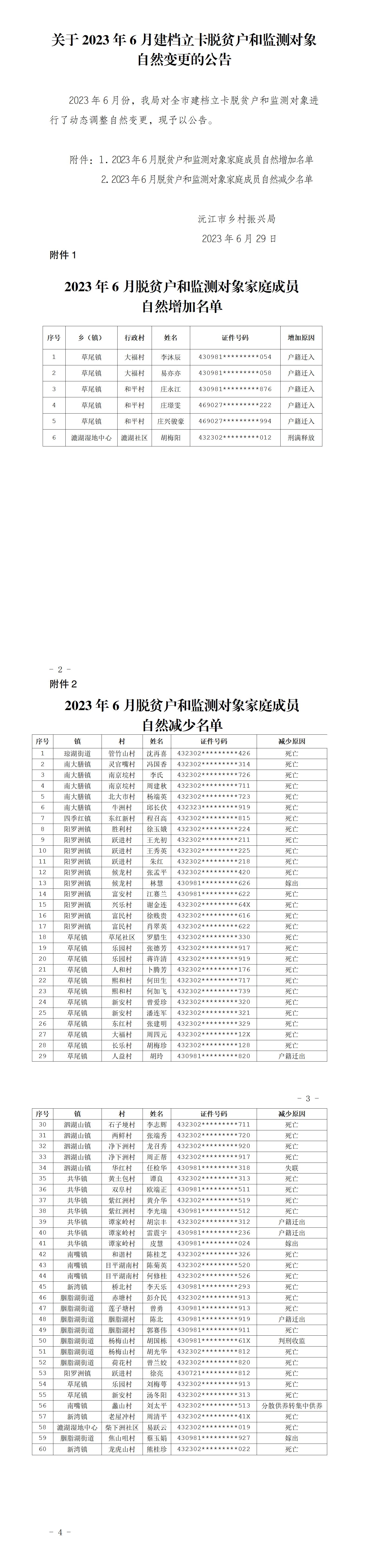 關于2023年建檔立卡脫貧戶對象和監測戶對象自然變更的公告(6月份)