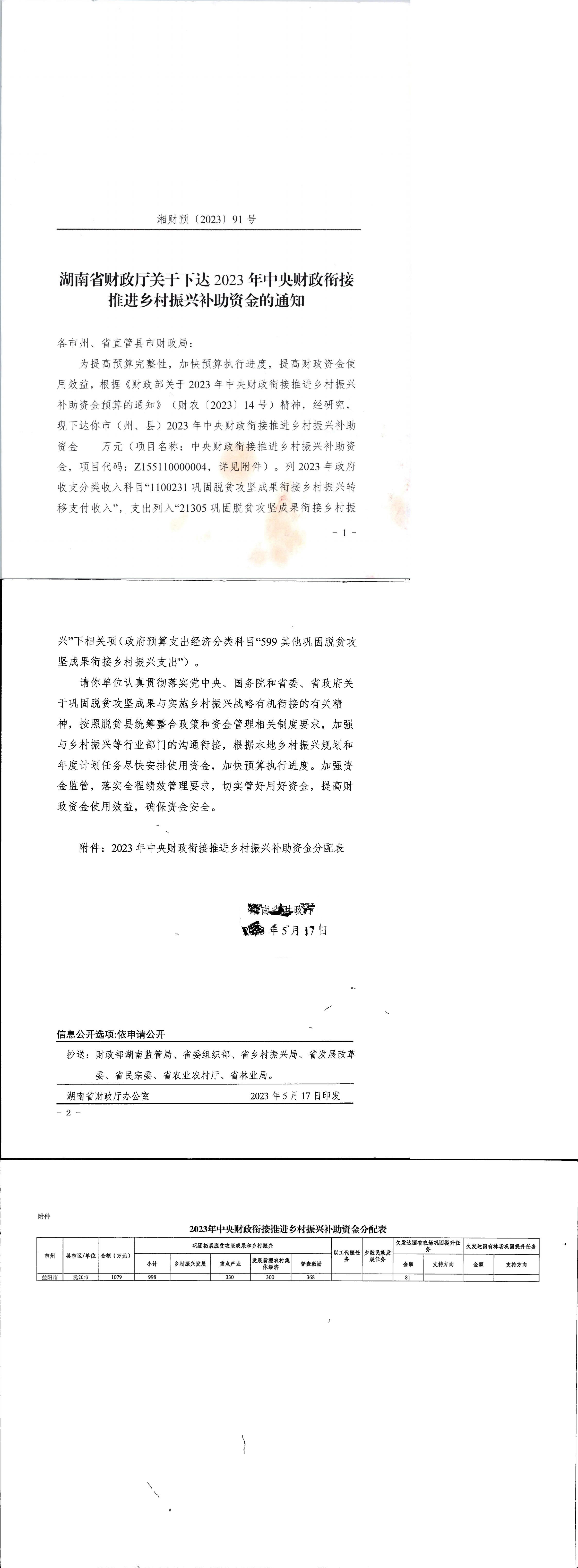 湘財預〔2023〕91號湖南省財政廳關于下達2023年中央財政銜接推進鄉村振興補助資金的通知