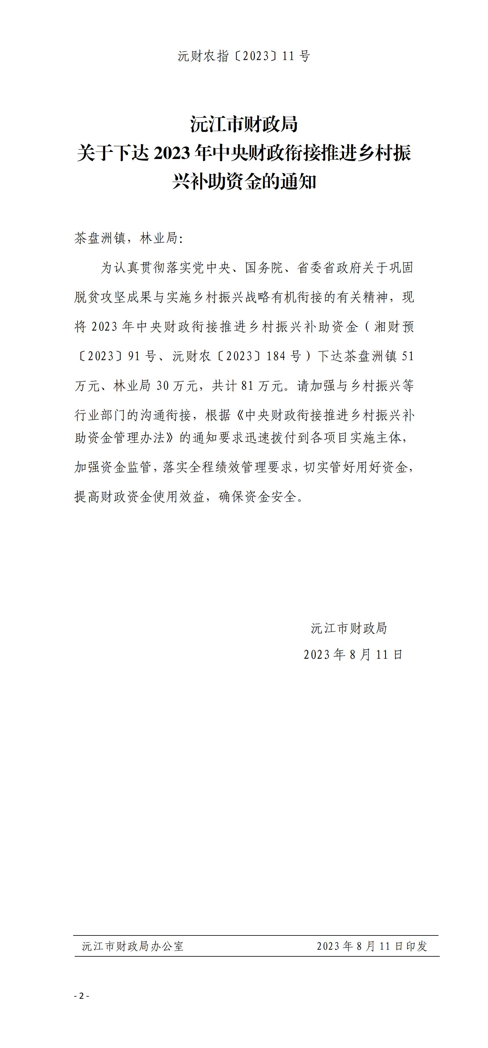 沅財農指〔2023〕11號 沅江市財政局 關于下達2023年中央財政銜接推進鄉村振興補助資金的通知