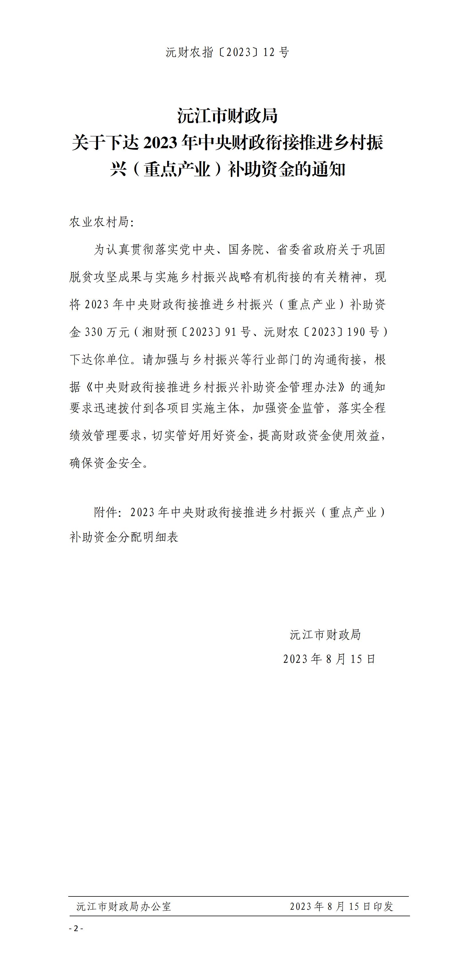 沅財(cái)農(nóng)指〔2023〕12號 沅江市財(cái)政局 關(guān)于下達(dá)2023年中央財(cái)政銜接推進(jìn)鄉(xiāng)村振興(重點(diǎn)產(chǎn)業(yè))補(bǔ)助資金的通知