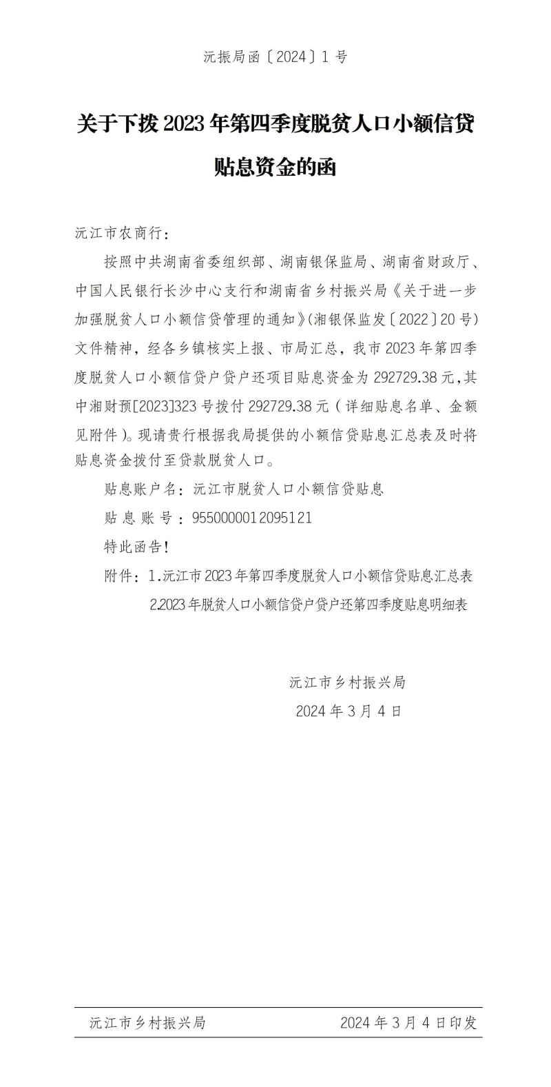 沅振局函〔2024〕1號關于下撥2023年第四季度脫貧人口小額信貸貼息資金的函