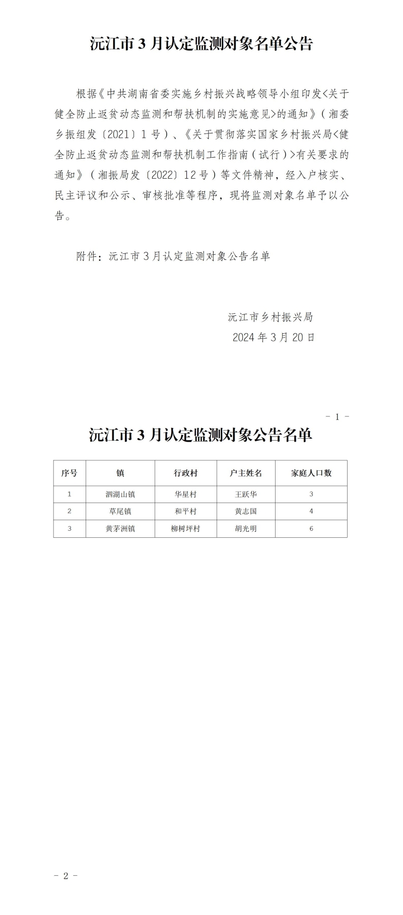 沅江市2024年3月認(rèn)定監(jiān)測(cè)對(duì)象名單公告