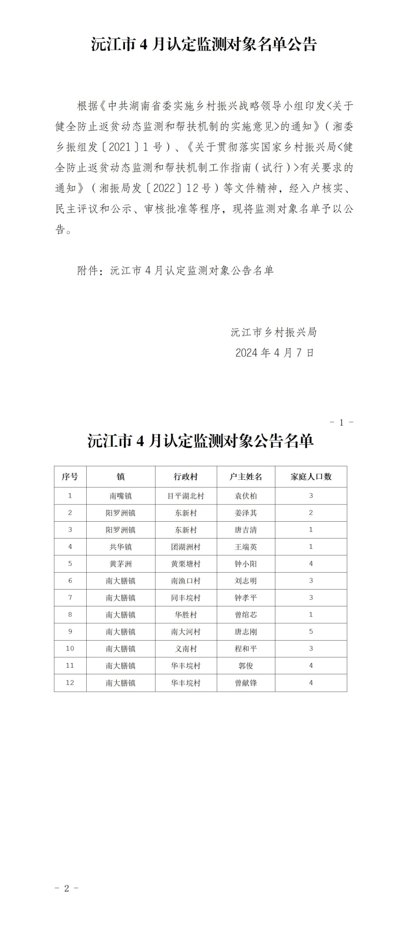 沅江市2024年4月認(rèn)定監(jiān)測對象名單公告