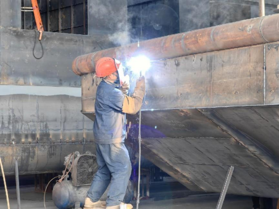 湖南萬駿船舶有限公司的工人正在焊接船體。